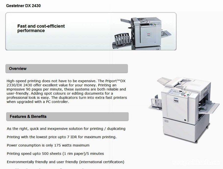 Mesin Digital Duplicator GESTETNER DX 2430 (Copy Printer) adalah mesin cetak yang menggabungkan tekhnologi photocopy, printer, offset dan scanner kedalam satu mesin.